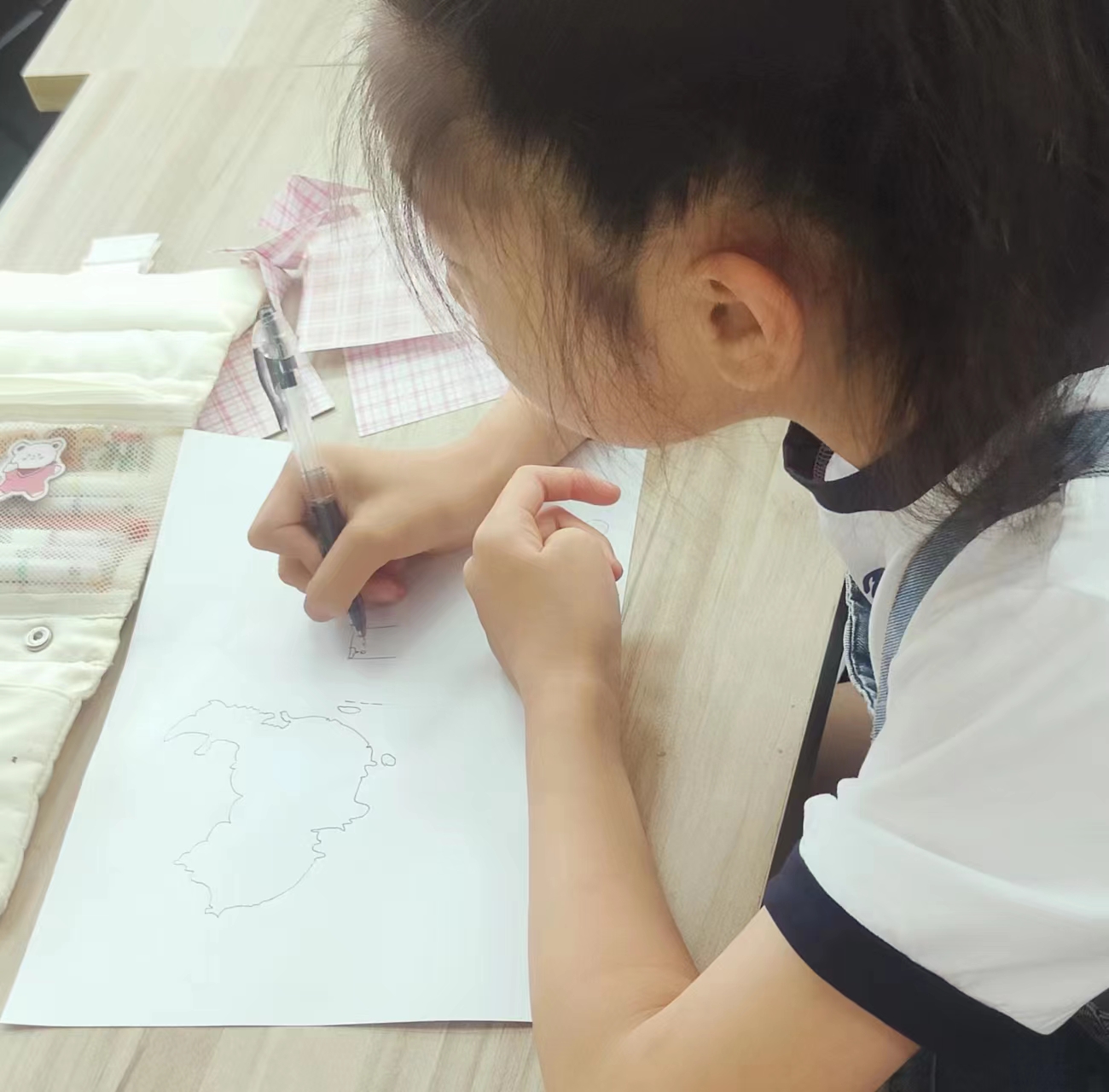 為了加深孩子們對(duì)中國(guó)地圖的認(rèn)識(shí),志愿者隨后設(shè)置了動(dòng)手繪畫中國(guó)地圖環(huán)節(jié)。在動(dòng)手繪畫環(huán)節(jié)中,孩子們拿起彩筆,運(yùn)用自己的彩色表達(dá)形式,在紙上繪出自己心中的中國(guó)地圖,表達(dá)對(duì)祖國(guó)的熱愛(ài)。