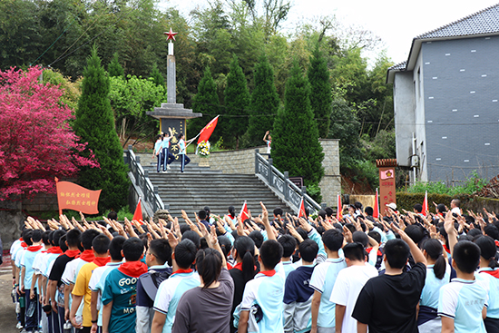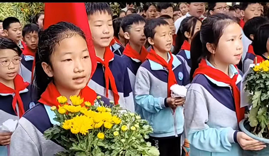 來到烈士墓前,在兩位主持人的主持下集體唱《中國(guó)少先隊(duì)隊(duì)歌》,童稚嘹亮的歌聲頓時(shí)回蕩在山林四周。四位少先隊(duì)員代表神情肅穆莊重地向烈士墓敬獻(xiàn)花籃。全體肅立,向革命先烈默哀。少先隊(duì)員代表在墓前獻(xiàn)詞,表達(dá)對(duì)烈士的崇敬與緬懷之情。德育主任金鐵鋒介紹葛理庸烈士的事跡。三個(gè)中隊(duì)的代表分別朗讀革命詩(shī)歌緬懷先烈的壯志與無畏的精神。大隊(duì)輔導(dǎo)員孟潔引領(lǐng)全體隊(duì)員重溫少先隊(duì)宣誓詞,鏗鏘有力的誓言表達(dá)了堅(jiān)強(qiáng)的意志和堅(jiān)定的信念。全體隊(duì)員分別擦拭墓碑、清掃四周,依序瞻仰紀(jì)念碑,向烈士敬獻(xiàn)自己親手制作的小白花。禮畢有序返回學(xué)校。