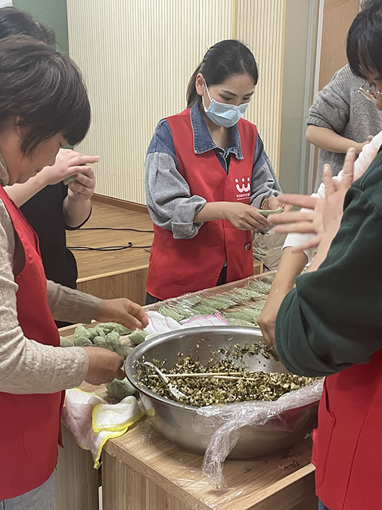 志愿者們耐心地把一個(gè)個(gè)新鮮制作的艾餃青團(tuán)裝盒打包送給老年活動(dòng)室的老人們以及小店、周邊廠房的村民群眾,讓他們一起感受春天的味道,感受街道工會(huì)、僑聯(lián)帶來(lái)的溫暖和關(guān)懷。