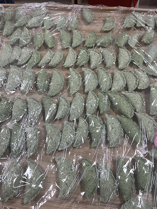 活動(dòng)現(xiàn)場(chǎng),居民們一起制作艾餃青團(tuán),揉面團(tuán)、煮青艾、拌餡料……不一會(huì)兒,一個(gè)個(gè)通體翠綠飽滿、模樣俏麗的艾餃青團(tuán)就成型了,然后擺入蒸鍋,空氣中散發(fā)著淡淡的清香,每個(gè)人的臉上都洋溢著燦爛的笑容。