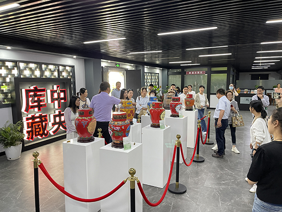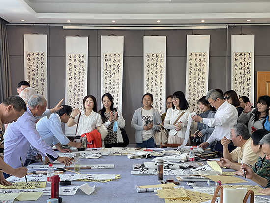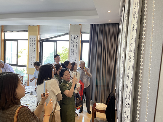 “屬雞的詩在哪里?”“有屬猴的詩嗎?”考察團(tuán)成員在書法創(chuàng)作室被“左筆書法大師”顧關(guān)心老師的書法作品吸引,紛紛用手機拍照留存。