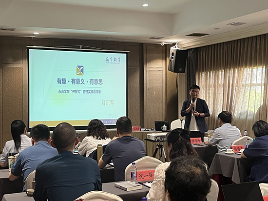 永嘉學(xué)院院長(zhǎng)、翔宇教育集團(tuán)副總校長(zhǎng)呂正軍作了題為《有趣·有意義·有意思》的專題講座,他結(jié)合永嘉學(xué)院“開放式”管理實(shí)踐與探索,分享了永嘉學(xué)院一批“有趣”的人(校長(zhǎng)和教師),將有意義的事情(開放教育事業(yè))干得“有意思”的生動(dòng)實(shí)踐,展現(xiàn)了永嘉學(xué)院教師們?cè)谛聲r(shí)代重注活力、重新激發(fā)生命力、重新思考教育存在的意義中持續(xù)“點(diǎn)擊刷新”的精神風(fēng)貌。