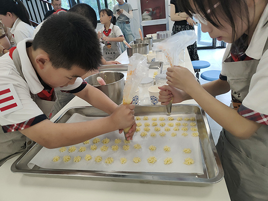 一個(gè)半小時(shí)的烘培學(xué)習(xí)中,學(xué)生不但學(xué)會(huì)了曲奇餅干的制作,還增強(qiáng)了動(dòng)手能力,體驗(yàn)了手工樂趣。(張孟華)