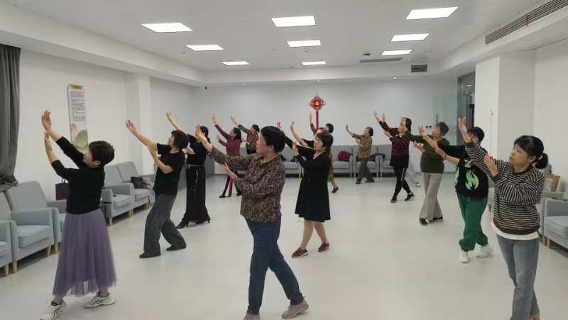 在港越社區舞蹈教室內,參加培訓的學員跟隨王老師的節奏口號簡單熱身后。隨著“風吹云動天不動,水推船移岸不移,刀切蓮藕絲不斷,山高水遠情不離……”的音樂旋律,進入了古典形體舞《煙雨唱揚州》的教學環節。王老師通過親身示范和耐心指導,幫助學員逐漸掌握舞蹈的基本姿勢和動作,通過反復練習和不斷努力。悠揚的歌曲伴隨著學員們的優美舞姿如夢如花綻放著。