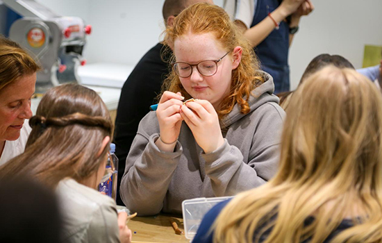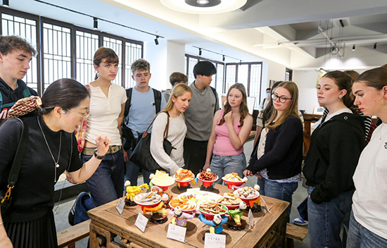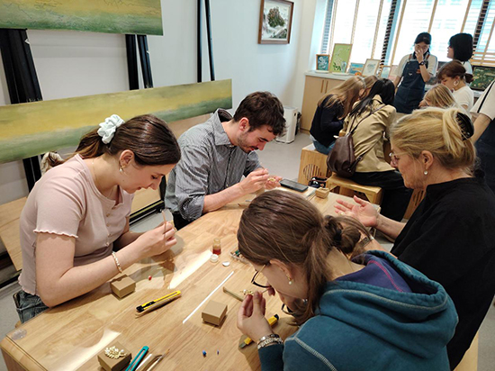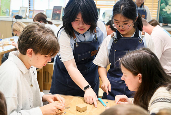 特別值得一提的是,在甌塑非遺傳承大師單曼曼的悉心指導下,德國師生們親手拿起塑形工具,沉浸式體驗甌塑制作的獨特魅力。從揉捻彩色油泥,到勾勒山水紋樣,指尖的藝術跨越語言隔閡。24工美2班的學生志愿者們全程耐心協助,以熱情的交流,搭建起藝術溝通的橋梁。