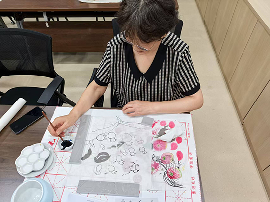 課桌上,硯臺里磨得細膩的墨汁泛著光澤,宣紙鋪展如素箋,學員們握筆的手雖有些許皺紋,卻透著專注與認真。老師手把手指導握筆姿勢,從“中鋒行筆”到“淡墨暈染”,耐心拆解每一個技法要領。張阿姨初學勾勒梅花,筆尖輕點間,幾瓣嫩蕊漸漸成形;李叔叔專注皴擦山石,墨色濃淡間暈出遠山意境,不時和鄰座學員交流“這筆怎么轉(zhuǎn)更自然”。