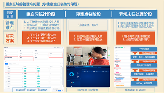 學(xué)校通過智慧校園平臺,打通 “氚云”“釘釘”“魔點”三大平臺的數(shù)據(jù)壁壘,搭建起智能化協(xié)同橋梁,實現(xiàn)精準智能預(yù)警:學(xué)生超時未歸信息會自動推送至社區(qū)民警;心理測評系統(tǒng)對 “三類預(yù)警學(xué)生” 進行實時分級告警,高危信息可直接同步至定點醫(yī)院,形成完整的風(fēng)險防控閉環(huán)。