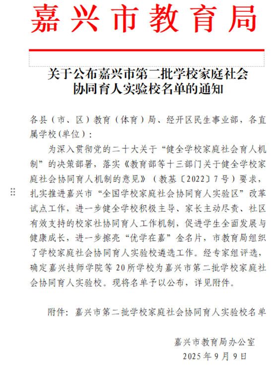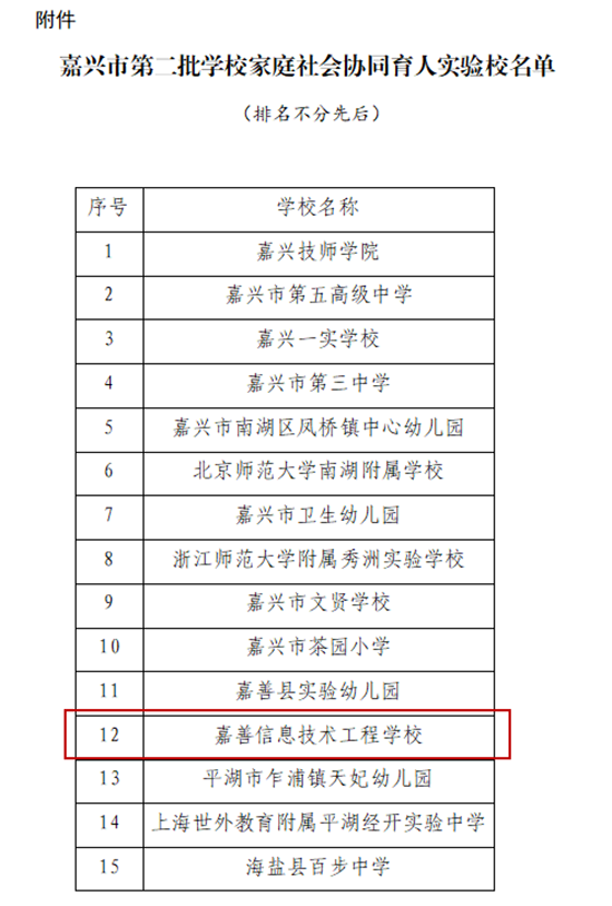 近日,嘉興市教育局公布第二批學(xué)校家庭社會協(xié)同育人實驗校名單,嘉善信息技術(shù)工程學(xué)校《探索“四共建二融合一橋梁” 家校社協(xié)同育人新生態(tài):陽光成長指導(dǎo)中心賦能學(xué)生全面發(fā)展》的優(yōu)秀實踐案例成功入選。
