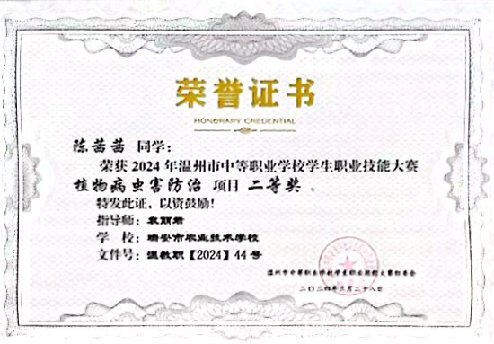 曾獲獎項:2024年浙江省植物病蟲害防治二等獎,國家獎學金,多次獲得校級獎學金,軍訓標兵,校級藝術節(jié)硬筆書法二等獎