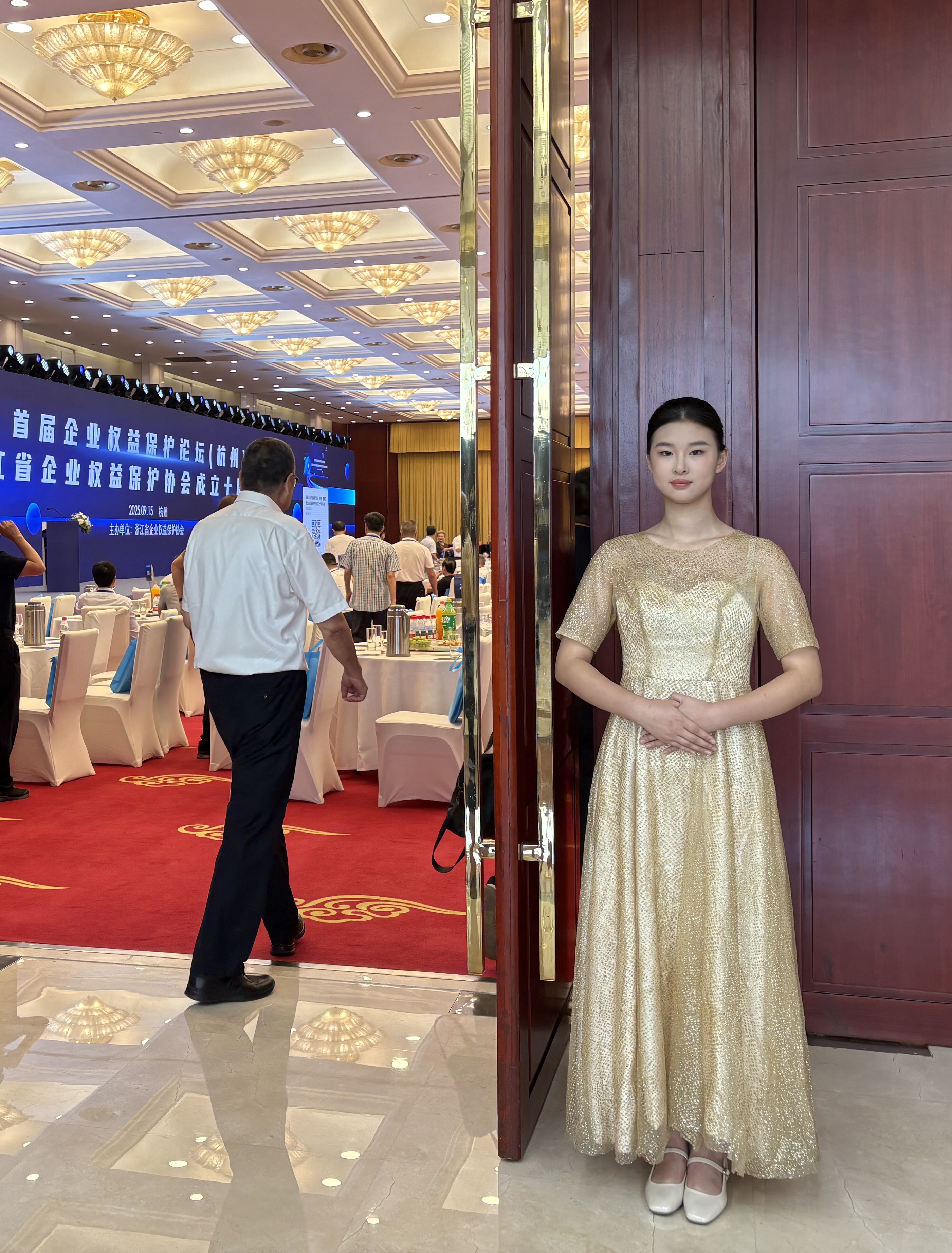 9月15日,浙江省首屆(杭州)企業(yè)權(quán)益保護(hù)論壇暨浙江省企業(yè)權(quán)益保護(hù)協(xié)會(huì)成立十周年慶典禮儀在浙江省人民大會(huì)堂宴會(huì)廳舉行,近700名法律專家及企業(yè)家參會(huì)。受浙江省企業(yè)權(quán)益保護(hù)協(xié)會(huì)的邀請(qǐng),杭州市喬司職業(yè)高級(jí)中學(xué)服裝表演專業(yè)有14名高二年級(jí)同學(xué)承擔(dān)了本次活動(dòng)的引導(dǎo)頒獎(jiǎng)禮儀工作,這些同學(xué)現(xiàn)場(chǎng)出色的表現(xiàn)受到參會(huì)領(lǐng)導(dǎo)嘉賓的一致好評(píng)。浙江省人民政府咨詢委員會(huì)副主任、浙江省企業(yè)權(quán)益保護(hù)協(xié)會(huì)會(huì)長(zhǎng)夏阿國(guó)評(píng)價(jià)道:“學(xué)生禮儀團(tuán)隊(duì)的專業(yè)表現(xiàn),為十周年慶典增添了青春活力,也展現(xiàn)了浙江職業(yè)教育的成果。”