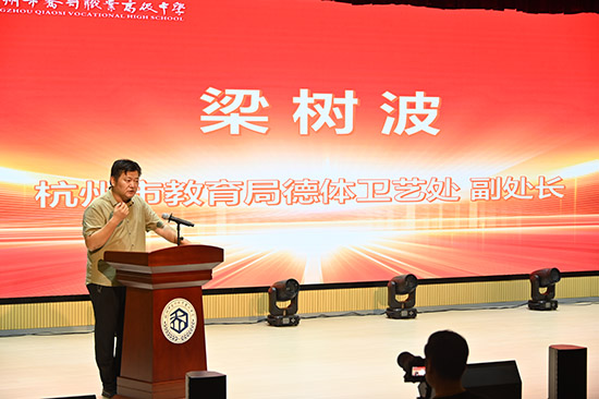 杭州市教育局德體衛(wèi)藝處副處長梁樹波講話。他表示,本次活動既是一個自我展示的平臺,也是教師階段性工作心得和技能成長的一種呈現(xiàn)。針對技能大賽課程展示活動,他提醒參賽的教師一是要注意對涉及到的學(xué)生信息的保密,對案例中的學(xué)生個人信息進行適當(dāng)?shù)哪:幚恚袑嵄U蠈W(xué)生隱私,二是要聚焦真實教育場景,從真實案例中提煉經(jīng)驗,杜絕形式主義,并清醒認識教育行為的專業(yè)邊界,確保所有展示內(nèi)容都服務(wù)于教師專業(yè)能力提升的根本目的。