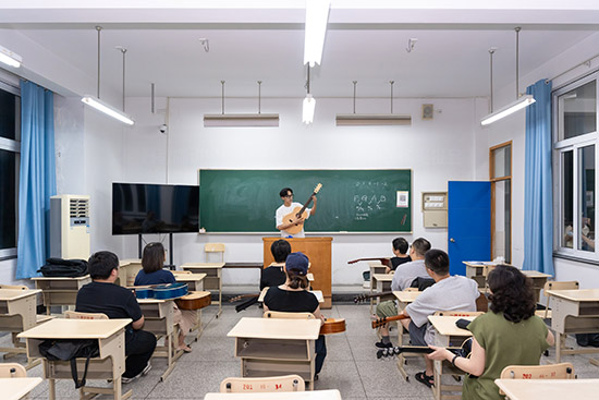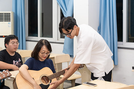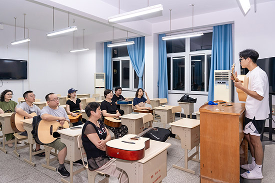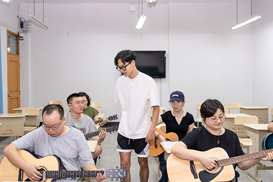 北302教室傳來陣陣吉他彈奏聲,潘宏鋮老師正指導學員們掌握基礎(chǔ)的彈奏技巧。學員們專注地撥動著琴弦,從簡單的和弦開始,逐漸嘗試彈奏完整的曲子。教室里充滿了歡聲笑語,每個人都在為自己的音樂夢想而努力。