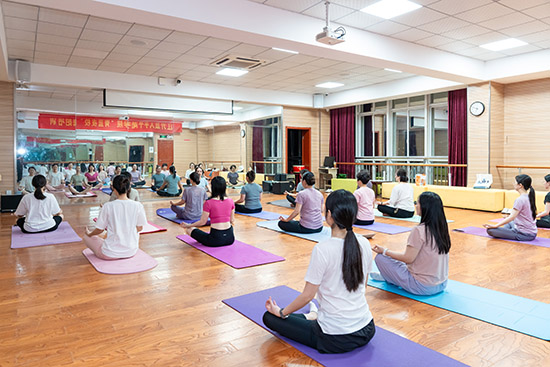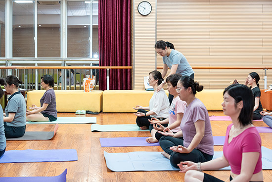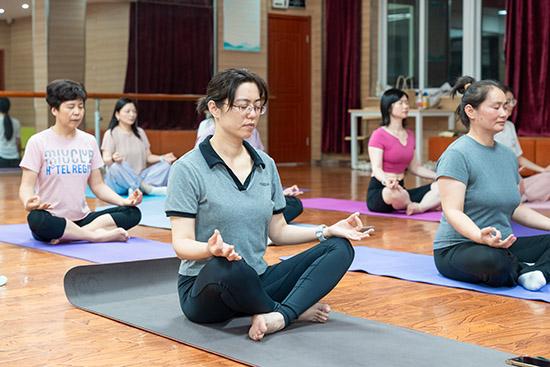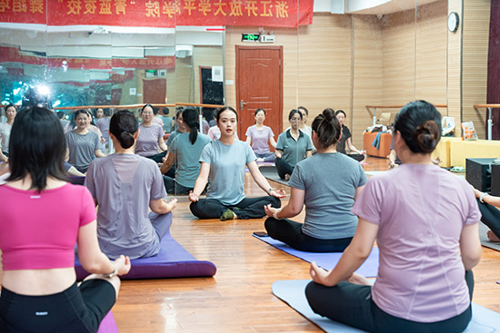 北404教室的瑜伽班上,金玲雪老師正指導學員們進行基礎(chǔ)瑜伽的練習。學員們在老師的口令下,緩緩舒展身體,感受每一個動作帶來的放松與舒適。教室里彌漫著寧靜與和諧,學員們在瑜伽的世界中找到了身心的平衡。