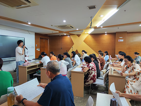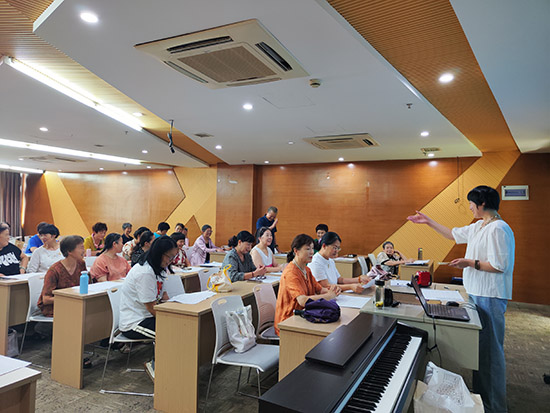 課程伊始,吳老師先讓學員們進行自我介紹、互相認識,有基礎(chǔ)的學員還哼上幾句越劇,讓老師把把關(guān)看看基礎(chǔ),也惹得學員們開懷大笑,大家在歡聲笑語中破冰。本次課吳老師教的是《何文秀—心連心選段》,吳老師從基礎(chǔ)唱腔入手,逐字逐句指導學員把握音準與節(jié)奏,同時示范經(jīng)典身段動作,如蘭花指、臺步等,耐心糾正細節(jié)姿勢。學員們神情專注,手持曲譜認真跟練,時而輕聲哼唱,時而模仿身段,遇到疑問及時向老師請教,互動氛圍熱烈。