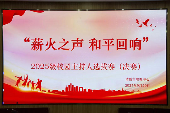 近日,諸暨市職業教育中心2025級“薪火之聲 和平回響”校園主持人大賽決賽在校多功能廳圓滿舉行。經過初賽選拔脫穎而出的10位選手在決賽中同臺競技,最終,25長征1班樓億、25工美班蘭紫怡兩位同學憑借出色表現榮獲一等獎。