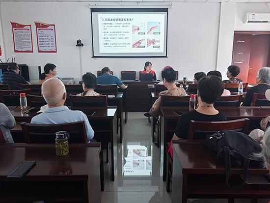 進入 “高脂血癥的危害” 講解環節,朱云老師通過圖文結合的方式,直觀展示高脂血癥對血管的損害過程 —— 多余的脂質沉積在血管壁形成斑塊,如同 “血管里的小石頭”,長期積累會導致動脈粥樣硬化,進而引發冠心病、腦梗死、腦出血等嚴重疾病。“很多人覺得血脂高沒癥狀就不用管,這是大錯特錯!” 朱云老師強調,高脂血癥被稱為‘無聲的殺手’,早期無癥狀但危害持續,尤其是中老年人、肥胖人群、有家族遺傳史的居民,更要定期檢測血脂。同時,她還分享了高脂血癥的預防方法,包括控制高油高糖飲食、每周堅持 150 分鐘中等強度運動、戒煙限酒等,建議居民根據自身情況制定健康管理計劃。