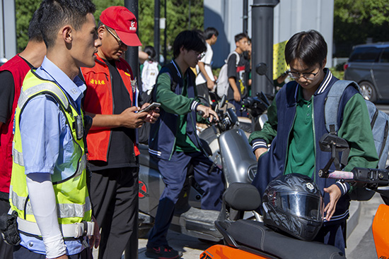 學(xué)校與諸暨市交警部門緊密聯(lián)動(dòng),將安全教育的課堂延伸到校門口,建立常態(tài)化合作機(jī)制。在上學(xué)與放學(xué)的高峰時(shí)段,交警們不僅全力疏導(dǎo)交通,更化身移動(dòng)的“安全宣傳站”。他們特別強(qiáng)調(diào)必須年滿16周歲方可騎行電動(dòng)車,并現(xiàn)場(chǎng)示范如何正確佩戴安全頭盔,提醒同學(xué)們騎行時(shí)不載人、不闖紅燈、不逆行,為平安出行筑起第一道防線。