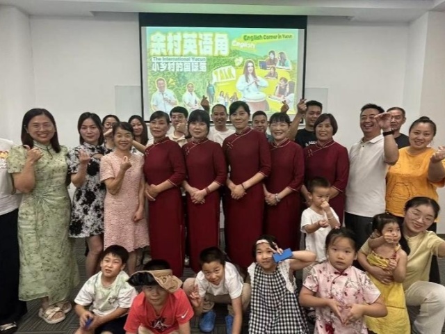 活動當(dāng)日,余村的活動室內(nèi)氣氛熱烈,投影屏幕上 “余村英語角” “小鄉(xiāng)村的國際范” 等字樣引人注目。參與活動的村民涵蓋老中青幼各個年齡段,大家齊聚一堂,興致勃勃地投入到英語交流與學(xué)習(xí)之中。身著喜慶服飾的村民與天真爛漫的孩子們,共同構(gòu)成了一幅充滿活力與希望的鄉(xiāng)村學(xué)習(xí)圖景。
