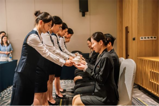 2025級新生代表身著專業制服,向企業師傅恭敬奉茶,一杯杯熱茶承載著對前輩的敬意,也象征著同學們開啟了職業探索的新旅程。