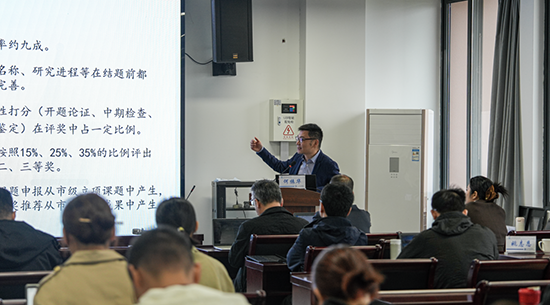 為進(jìn)一步加強(qiáng)市直屬學(xué)校(單位)教科研課題的過程性管理,提高課題研究質(zhì)量和水平,近日,市直屬學(xué)校(單位)課題研究培訓(xùn)會(huì)在浙江信息工程學(xué)校順利舉行。浙江省教育科學(xué)研究院規(guī)劃辦陳侃老師、湖州市教育科學(xué)研究中心副主任周凌、教研員何振華和教研員沈瑩琪、浙江信息工程學(xué)校副校長(zhǎng)姚志恩,市直屬各校教科工作負(fù)責(zé)人,以及相關(guān)課題人員出席本次會(huì)議。