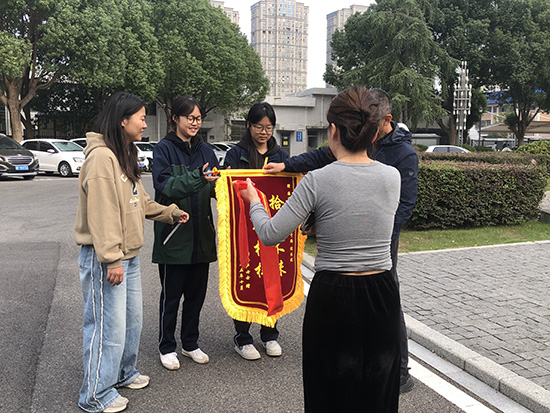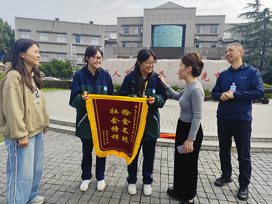 這份感動并未止步于電話。10月27日,失主女士專程來到海寧衛生學校,將一面書寫著“拾金不昧 品德高尚”的錦旗送到了兩位同學手中,當面向她們表達了誠摯的謝意。她說:“從這兩個孩子身上,我看到了海寧衛校學生優秀的品質和良好的教養,你們學校的育人成果,值得肯定!”