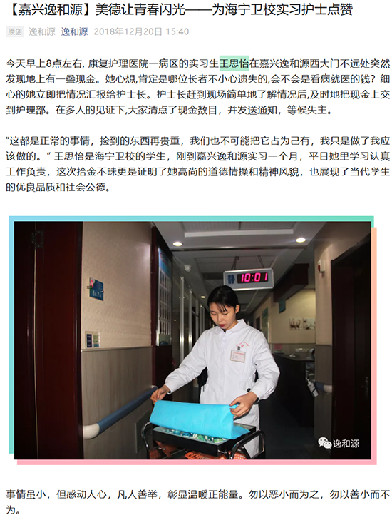 武于路和沈佳妮同學拾金不昧的行為,也是學校長期以來注重立德樹人的生動體現。在黨政班子的有力領導下,學校始終堅持“育人育才并舉,育才先育人”理念,將德育貫穿于教育教學的全過程,培養“勤于學習、精于操作、善于溝通、甘于奉獻”的海衛天使。健康所系,性命相托,學校從主題班會到校園文化活動,從課堂思政到社會實踐,無不浸潤著對學生品德修養的塑造。這一次的暖心事件,正如之前公交車上教科書式救人的華智宇、商場里施救急癥病人的凌琴琴、街頭對倒地老人展開急救的孫晶晶與孫潔、實習醫院里拾金不昧的王思怡、實習崗位上以精湛技能貼心護理感動病人的張輝和楊瀅瀟……一個個美麗的天使的涌現,正是學校育人成果的生動縮影。