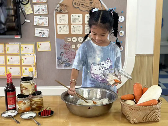 “霜降腌蘿卜”是刻在傳統里的生活智慧。活動伊始,老師帶著新鮮蘿卜拋出問題:“蘿卜長在土里還是樹上?”“我們吃的是蘿卜的根還是葉子?”帶著好奇,孩子們走進“快樂農場”親手播下蘿卜種子,期待泥土里的驚喜;回到教室后,大家圍坐在一起,洗蘿卜、切蘿卜、撒鹽腌制,看著清脆蘿卜慢慢入味。這不僅是一次民俗美食制作,更讓孩子們在實踐中懂得了“順應時節”的生活道理。