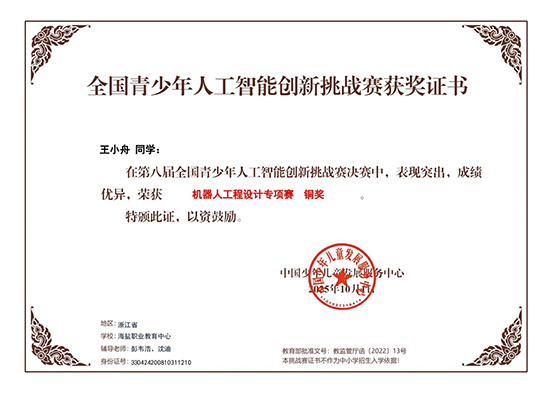 近日,第八屆全國青少年人工智能創新挑戰賽全國總決賽圓滿落幕。海鹽職業教育中心曹敏、王璟文、王小舟學生團隊再度載譽而歸,榮獲一銀、二銅的優異成績!