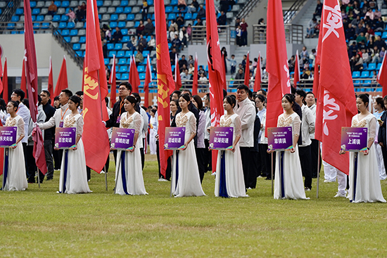 開幕式上,由學校120名男生組成的紅旗方隊率先吸引了全場的目光。隊員們步伐鏗鏘、身姿挺拔,手中的紅旗迎風招展。他們以飽滿的精神狀態與昂揚的斗志,盡顯嚴肅認真、擔當有為的精神風貌。