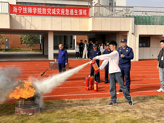 疏散環節結束后,消防專家現場教學環節接踵而至。海寧市消防救援大隊胡升輝隊長與尖山專職消防隊白效林隊長,分別結合近年來發生的典型校園火災案例,向師生們系統講解了日常學習生活中的消防安全知識、常見火災隱患的排查與防范、以及火場自救互救的關鍵措施。理論講解深入淺出,警示性強。隨后,在消防隊員的指導下,師生代表踴躍參與了滅火器、消防水帶等常用消防器材的操作體驗和油盆滅火實操演練。通過“零距離”接觸和親身實踐,師生們有效掌握了撲救初期火災的基本技能和應急救援處置要領,對消防安全有了更為直觀和深刻的理解。