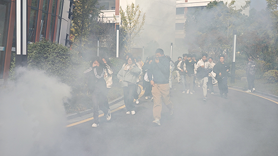 上午8時整,刺耳的消防警報聲在兩校區驟然響起,模擬火場環境的煙霧迅速彌漫開來。演練總指揮部一聲令下,全員進入應急狀態。三千余名師生立即反應,在各樓層、通道關鍵點位疏散負責人的清晰指引下,嚴格按照消防逃生要領——彎腰、低姿、用濕毛巾捂住口鼻,沿著預定的疏散路線,快速、有序地向操場等指定安全區域撤離。疏散過程中,教師們沉著冷靜,時刻關注學生動態,不斷提醒“注意腳下”“不要擁擠”,確保撤離過程忙而不亂,不落下任何一名學生。整個疏散流程銜接緊密,動作規范,全體師生展現了高度的配合與參與度。