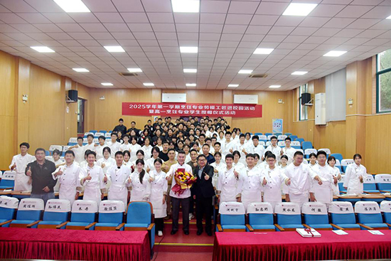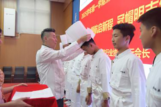 “我宣誓:擇一事、終一生,立志成為一名品德優良、技能精湛、身心健康的工匠儒廚!”在孫偉民部長的領誓下,全體新生右手握拳高舉,誓詞穿透報告廳,落在每個人的工位牌與職業裝衣襟上。從此,這頂白帽不再是簡單的服飾,而是系圍裙、握炒勺時的“初心徽章”,是踐行“命由心造,德自行為”的責任象征。