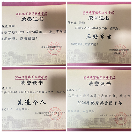 沈馭凡,男,平湖市職業中專工藝美術2023屆畢業生,現就讀于浙江經貿職業技術學院傳播與策劃專業,大學期間擔任團支書、院融媒體中心副負責人及校全媒體中心影像制作部部長等職務。他的實踐足跡輻射校園、鄉村直至國際舞臺,曾以導演助理身份參與國家廣電總局、中央廣播電視總臺紀錄片制作。他累計獲國家級榮譽4項、省市級獎項16項。2025年,他獲得了浙江省普通高職院校國家獎學金。