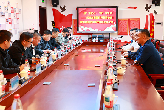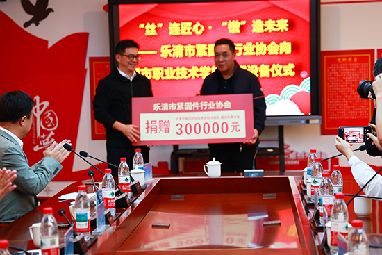 接著,捐贈授牌環(huán)節(jié)啟動,聞金普會長將刻有“樂清市緊固件行業(yè)協(xié)會捐贈300000元”的捐贈牌,鄭重遞交給陳肖龍校長,雙方合影留念,標(biāo)志著8臺冷鐓機、6臺搓絲機等實訓(xùn)設(shè)備正式“落戶”學(xué)校,校協(xié)合作邁入新階段。