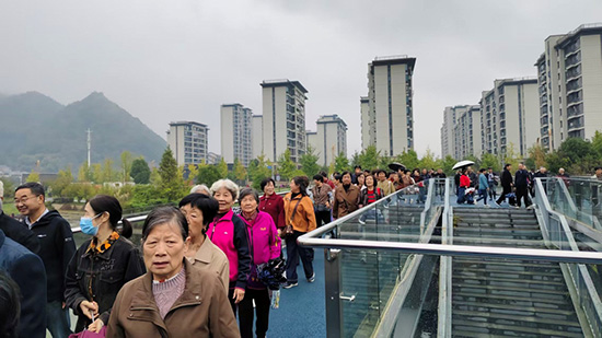 銀齡教師精神抖擻地健步向前,浩浩蕩蕩的健步行大軍如同一條蜿蜒的長龍,在仙縣遂昌的凱恩路——園丁路騎行綠道——觀瀾府——鋼架景觀橋——青鄰里上行進。