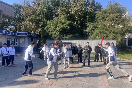 11月20日上午9時(shí)10分,德清職業(yè)中專校門口出現(xiàn)一名“暴徒”。該“暴徒”正持仿真砍刀沖擊校門,四位安保手持護(hù)盾、3米長(zhǎng)叉與抓捕器,組成“人墻”死死擋住了“暴徒”,他們大喊:“按警報(bào)!通知各樓層鎖門!”于此同時(shí),兩名保安手持護(hù)盾左右站位,形成防御姿態(tài),中間兩位保安分別持長(zhǎng)叉和抓捕器,瞬間將“暴徒”控制。