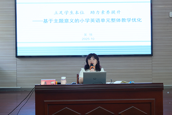 湖州市教育科學(xué)研究中心小學(xué)英語教研員吳悅以《立足學(xué)生本位 聚焦素養(yǎng)提升——基于主題意義的小學(xué)英語單元教學(xué)實(shí)踐與優(yōu)化》為題,結(jié)合新課標(biāo)與區(qū)域案例,系統(tǒng)闡述了單元整體教學(xué)的理念。她重點(diǎn)提出了五項(xiàng)教學(xué)建議:樹立學(xué)生視角備課、以素養(yǎng)提升設(shè)計(jì)活動(dòng)、強(qiáng)化學(xué)科育人意識(shí)、落實(shí)“—學(xué)—評(píng)”一體化、注重板書邏輯性,為教師們帶來了兼具理論與實(shí)踐價(jià)值的指引路徑。