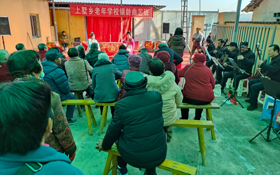 上墅學習中心的越劇老年長班經過多年積淀,每個學員從最初的不會如今都變成了能登臺獻藝的業余演員,為匯報成績鞏固學藝成果,我們想到了送戲進村一舉雙得的活動形式。首站劉家塘村越劇專場活動緊扣當地群眾喜好,精選了《何文秀——心連心》《王老虎搶親——寄閨》《碧玉簪——送鳳冠》《孔雀東南飛——洞房》等多個經典越劇片段,讓村民們耳目一新地感受越劇的獨特魅力。簡陋的舞臺悠揚的弦樂響起,演員們身著精致戲服,扮相俊美,步態輕盈,靈動的身段、婉轉的唱腔,不時贏得臺下陣陣掌聲。