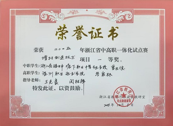 2025年12月5日,由浙江省教育廳主辦的2025年浙江省中高職一體化試點賽增材制造技術項目在諸暨市實驗職業技術學校順利閉幕。最終,瑞安市塘下職業中等專業學校數控專業學生曾世俊(指導師:王克豪)與溫州職業技術學院瑞安學院學生岑泉林(指導師:閔林鋒)組成的團隊,憑借扎實的專業功底和出色的實踐能力榮獲浙江省一等獎。這一亮眼成績的取得,是瑞安市和溫州職業技術學院長期深入合作的結晶,更是瑞安市塘下職業中等專業學校作為溫州職業技術學院附屬學校區域中高一體改革實踐的生動寫照。