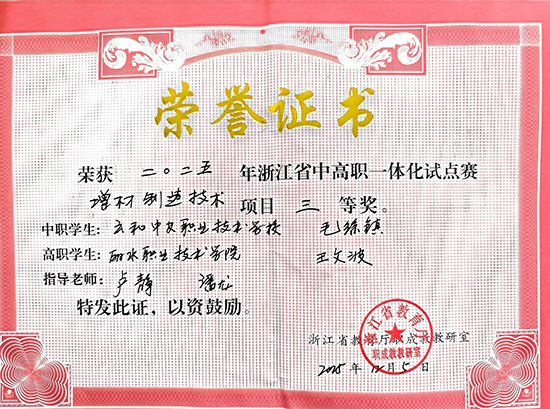 12月5日,浙江省中高職一體化試點賽正式收官,云和縣中等職業技術學校的毛徐鎮(中職)和來自麗水職業技術學院的王文波(高職)組隊,一路披荊斬棘,成功獲得“增材制造技術”項目三等獎。值得驕傲的是,王文波也是學校數控技術應用3+2的學生,這充分展現了學校在中高職一體化人才培養方面的持續性與連貫性。