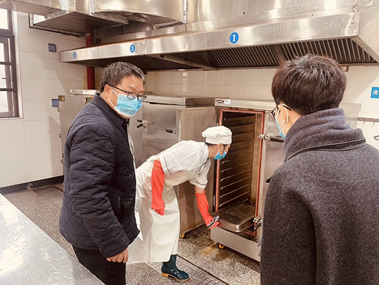 隨后,孫文明來到校長室,與校長趙娜就校園餐管理工作進(jìn)行深入交流。趙娜匯報(bào)了當(dāng)日食堂巡查情況,并與孫文明共同填寫督導(dǎo)檢查用表。雙方隨即前往學(xué)校食堂,對照信息公示、人員管理、設(shè)施設(shè)備、采購貯存、制作留樣、環(huán)境衛(wèi)生六大督查要點(diǎn)開展實(shí)地檢查。督查發(fā)現(xiàn),食堂各項(xiàng)工作均嚴(yán)格落實(shí)規(guī)范要求:墻面公示內(nèi)容齊全、張貼有序;工作人員著裝統(tǒng)一、全程佩戴口罩;功能分區(qū)科學(xué)合理,各類工具按色標(biāo)分類存放;留樣冰箱嚴(yán)格執(zhí)行“雙人雙鎖”制度,食品留樣規(guī)范到位;食材貯存做到離地離墻、分類擺放,標(biāo)識清晰明確。檢查時(shí),食堂工作人員正開展餐后清掃沖洗工作,地面存在潮濕情況,督查人員當(dāng)即提醒,務(wù)必及時(shí)做好地面干燥處理,防范人員滑倒風(fēng)險(xiǎn)。