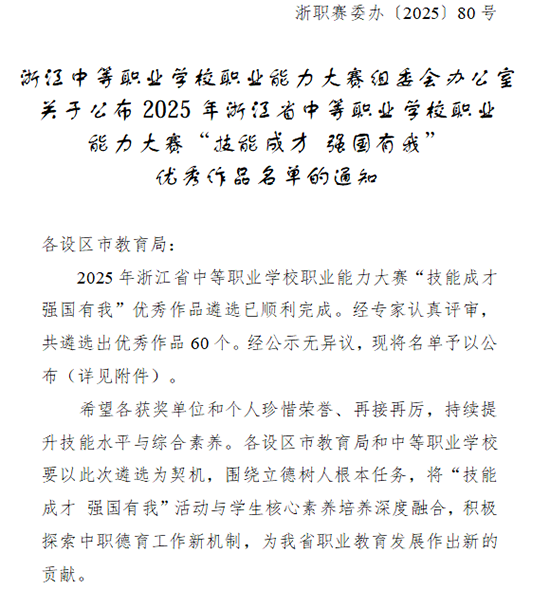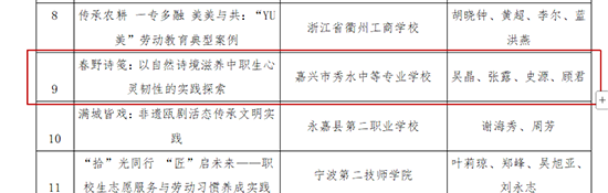 近日,浙江省教育廳公布2025年全省中等職業學校職業能力大賽“技能成才 強國有我”優秀作品名單,嘉興市秀水中等專業學校報送的《春野詩箋:以自然詩境滋養中職生心靈韌性的實踐探索》成功入選。
